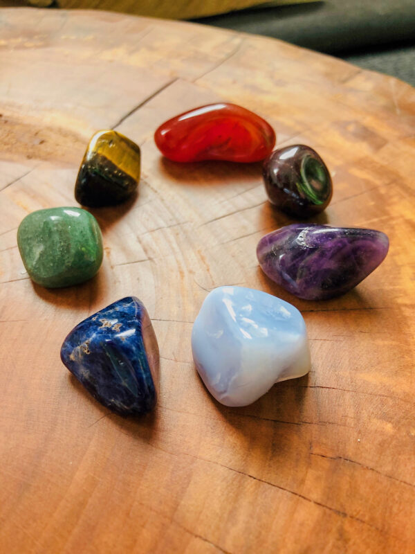 Kristalni komplet čakra iz aventurina, karneola, ametista, granata, sodalita, modrega ahata in tigrovega očesa. Ljubljenčku položimo na ležišče v blazinici, pod nadzorom oz zagotovimo varnost, da ne poje kakšnega kristala ali da ne pride do zadušitve..