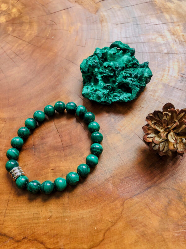 Naj vas podprejo močne energije malahita. Čarobna kristalna zapestnica Malahit obsega 16 cm.